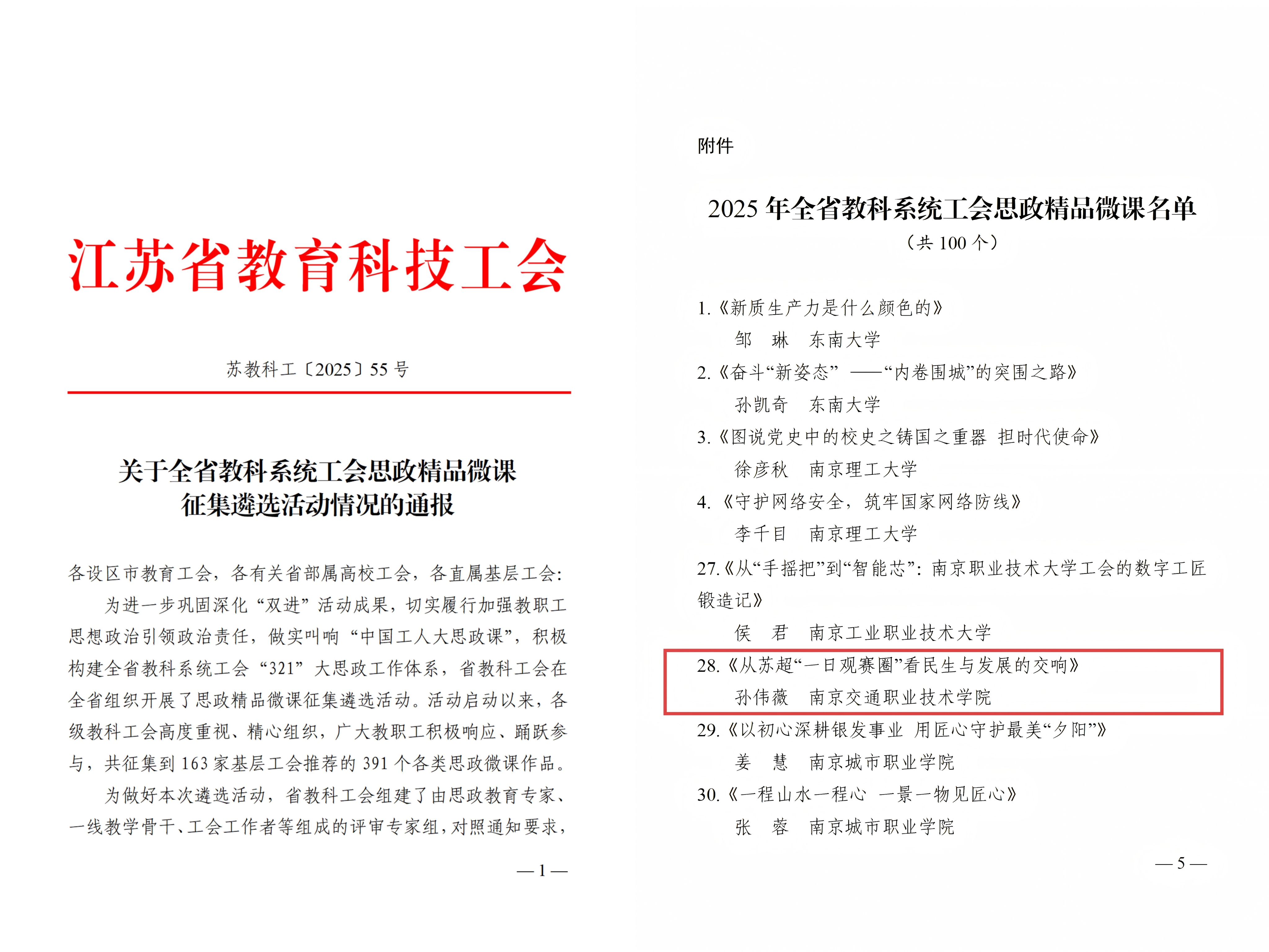 近日,江苏省教育科技工会发布了《关于全省教科系统工会思政精品微课征集遴选活动情况的通报》,学校孙伟薇老师创作的微课作品《从苏超“一日观赛圈”看民生与发展的交响》成功入选全省100个思政精品微课名单,这彰显了学校在思政教育创新实践中取得的扎实成效。