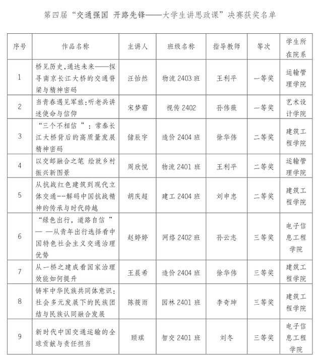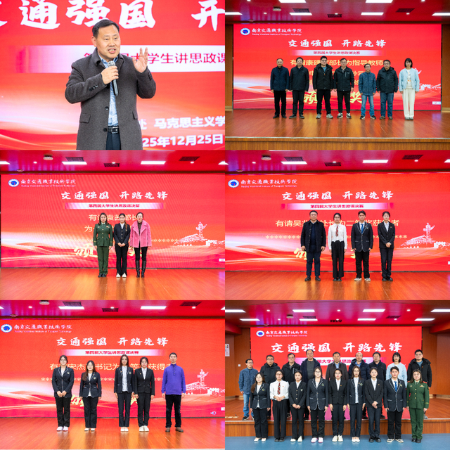 本次“大学生讲思政课”依托《习近平新时代中国特色社会主义思想概论》课程的实践教学,经过初赛、复赛,共有9组选手进入决赛。决赛现场气氛热烈,选手依次登台,以青年的视角、青年的语言、青年的激情,结合专业所学与国家交通事业发展,生动讲述了学习思政课的心得体会,深刻阐释了新时代交通青年的责任与使命。选手们的讲述主题鲜明、案例鲜活,或以南京长江大桥这座“争气桥”为例讲述大桥精神如何在中国交通从自立到自强的壮阔征程中持续闪耀;或讲述当青春遇见军旅,磨砺淬炼“以我之青春,护我之家国”的信仰与担当;或从杨根思的铮铮誓言到常泰长江大桥实现多项世界首创,生动诠释高质量发展的精神密码;或从一穷二白到高铁领跑全球,从“出行难”到“物流通天下”,带领我们见证新时代中国交通运输的全球贡献与责任担当。
