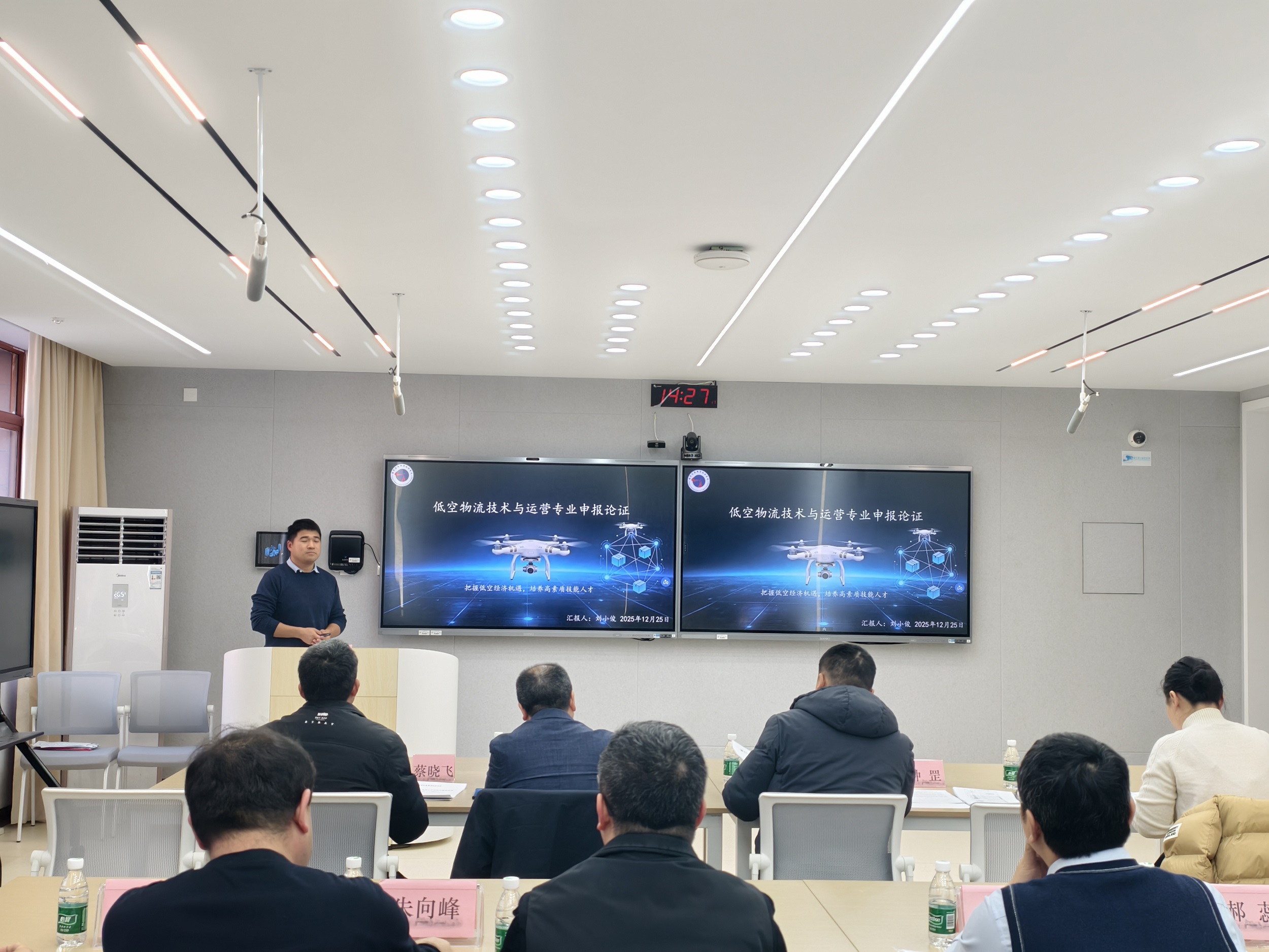 会上,刘小俊老师代表专业筹备组,围绕专业申报背景、人才需求、目标定位、课程体系、师资队伍、实训条件及订单式人才培养等核心内容进行了系统全面的汇报。在交流研讨环节,与会专家结合申报材料、现场汇报及低空经济产业发展现状,展开了深入细致的研讨。专家们一致认可设置“低空物流技术与运营”专业的必要性与迫切性,认为该专业紧扣低空经济发展风口,精准填补了行业人才培养空白。同时,专家们就专业定位细化、人才培养规格优化、课程体系模块化构建、产教融合深度推进等方面提出了针对性强、可操作性高的宝贵意见,为新专业申报工作及后续高质量建设提供了重要指导方向。