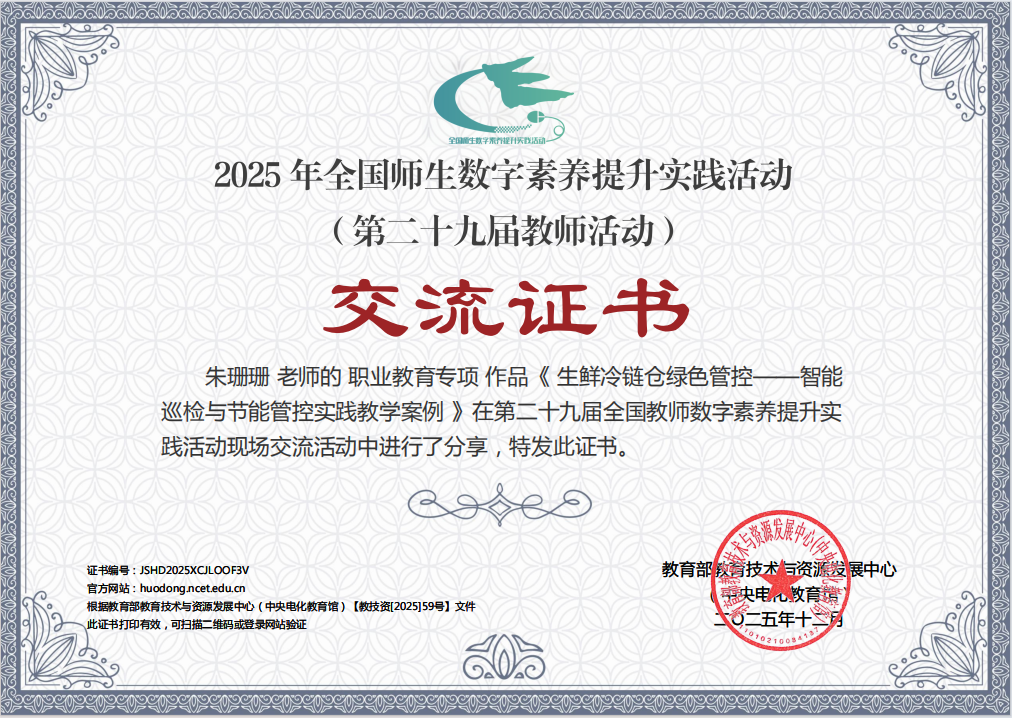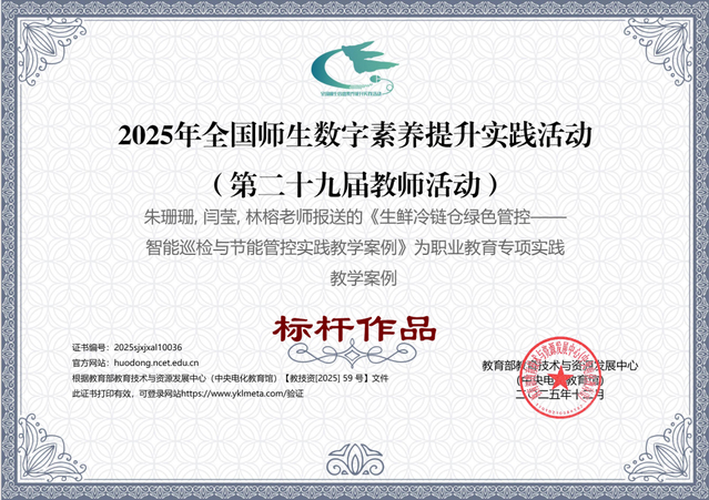 近日,由教育部教育技术与资源发展中心(中央电化教育馆)主办的2025年全国师生数字素养提升实践活动(第二十九届教师活动)现场交流活动在福建泉州圆满举行。运输管理学院朱珊珊、闫莹、林榕老师团队报送的《生鲜冷链仓绿色管控——智能巡检与节能管控实践教学案例》获评职业教育专项实践性教学案例“标杆作品”,并参加现场交流展示。