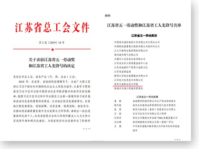 在“五一”来临之际,江苏省、南京市于近日举行了庆祝“五一”国际劳动节系列活动,分别表彰和命名了一批先进单位、先进个人。学院喜获江苏省五一劳动奖状、南京市五一劳动奖状荣誉称号,是荣获南京市五一劳动奖状的唯一高校,全省交通运输系统仅有两家单位荣获江苏省五一劳动奖状。