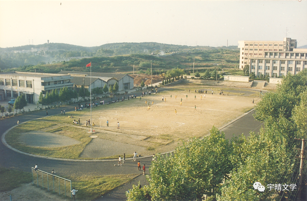 操场就在主干道的西面,主席台紧临主干道,南面有两堵墙,上面印着一代伟人毛泽东题写的“发展体育运动,增强人民体质”红色大字。从台阶走上去,墙的南面是黑板报,上面经常刊有我写的文章,当然都是学生会宣传部的同学,用粉笔一笔一画写上去的。