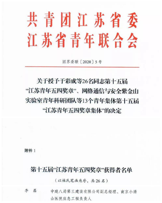五四青年节到来前夕,共青团江苏省委、江苏省青年联合会公布了第十五届“江苏青年五四奖章”获得者、第十五届“江苏青年五四奖章集体”名单。学院2007届毕业生,中建八局第三建设有限公司副总经理,南京小汤山医院应急工程负责人李磊荣获“江苏省五四青年奖章”。