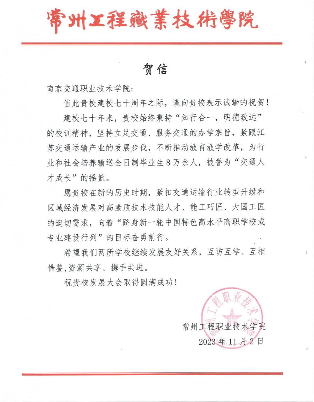 常州工程职业技术学院贺信