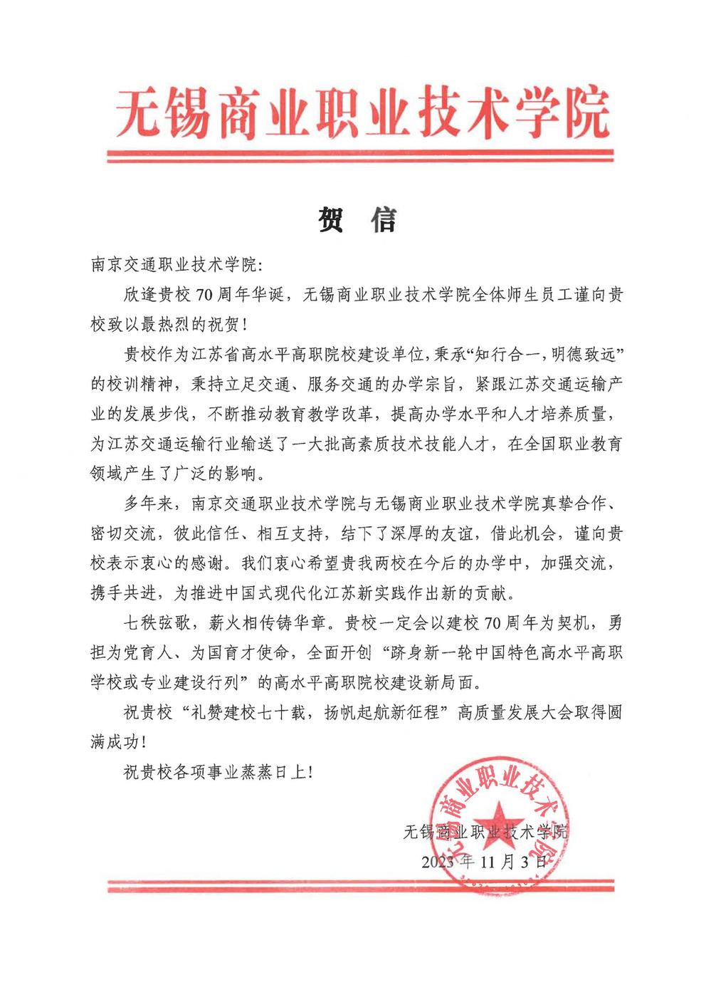 无锡商业职业技术学院贺信
