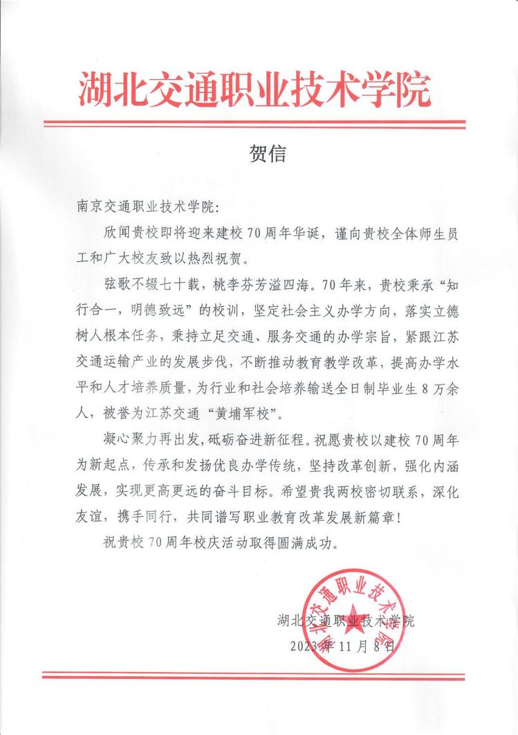 湖北交通职业技术学院贺信