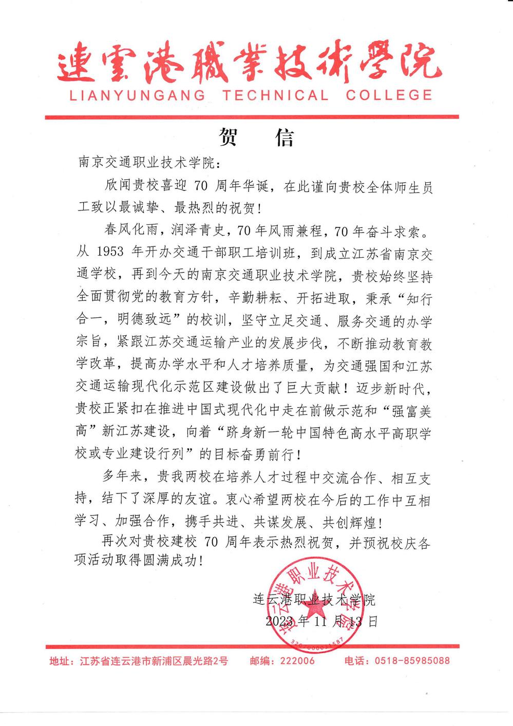连云港职业技术学院贺信