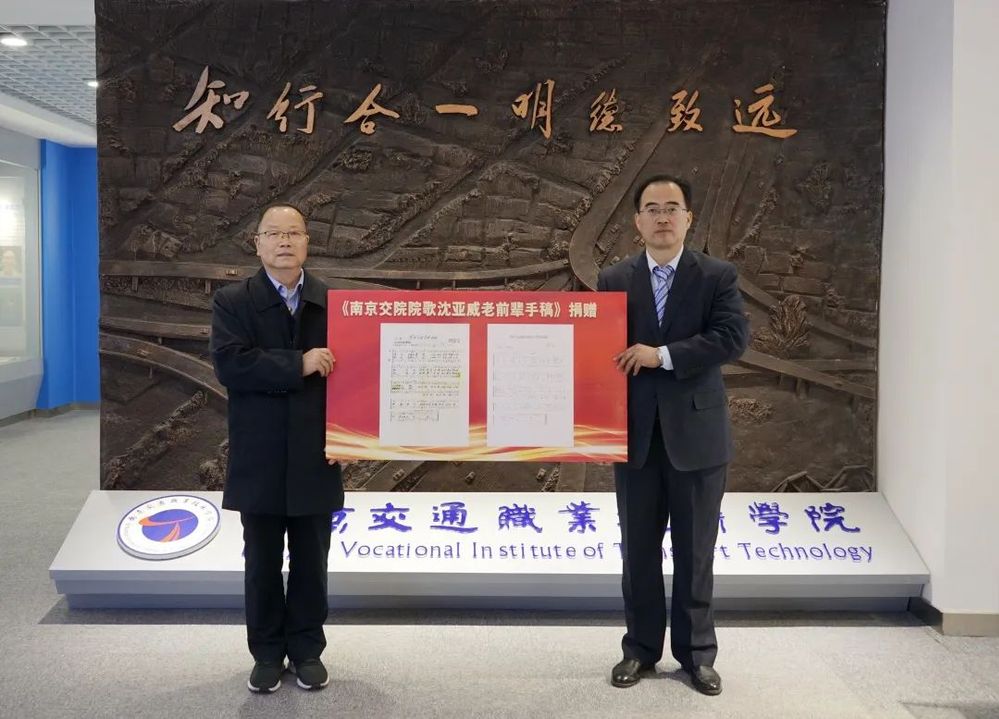 大会当天,校友万江波向学院捐赠了由著名作曲家沈亚威作曲的《南京交通学校校歌》手稿。万江波老师根据校歌创作过程,撰写了《覆盖在歌谱里的即时贴》文章,刊发在《南京日报》。学院副院长谢剑康,党委委员、组织部部长康建军,党委委员、宣传部部长袁茜参加捐赠仪式。