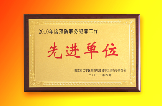 4月12日,在江宁区预防职务犯罪工作会议上,学院被江宁区检察院授予“2010年度预防职务犯罪先进单位”荣誉称号。学院题为《加强教育 完善制度 强化监督 有效做好预防职务犯罪工作》的总结报告入选职务犯罪预防经验交流文集。