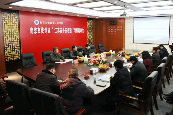 继去年11月,学院创建“江苏省平安校园” 顺利通过市级考核验收后,2月28日下午,学院迎来了“江苏省平安校园”省级考核验收。专家组由东南大学保卫处任祖平处长、南京林业大学保卫处汪兴安调研员、省高教保卫学会宋涛副秘书长、省教育厅安稳处刘振华副主任科员组成。院党委书记贾俐俐、党委副书记许正林、副院长周传林,南京市公安局、江宁大学城管委会、江宁公安分局有关领导及学院相关部门负责人、各党总支书记参加了汇报会。考核验收汇报会在行健馆会议室举行。