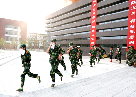 15:30,消防演练正式开始。模拟火灾现场,图文信息楼内学生在现场工作人员指挥下,手拿毛巾捂住口鼻按预定疏散路线有序进行疏散;医疗组冲进现场开展抢救;心理疏导小组对现场学生进行安抚;消防车在“校园