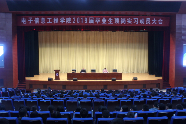 为进一步加强顶岗实习期间的教学和学生管理工作,11月22日上午,电子信息工程学院在图书馆报告厅召开了2019届毕业生顶岗实习动员大会。校保卫处副处长周家明、电子信息工程学院相关老师、2016级全体学生参加了大会。