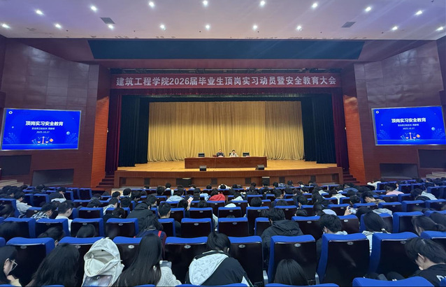 10月27日下午,建筑工程学院在图书馆报告厅召开2026届毕业生顶岗实习动员暨安全教育大会。学院党政领导班子成员、保卫处处长周家明、2026届全体毕业生参加会议,会议由学院党总支书记张丽君主持。
