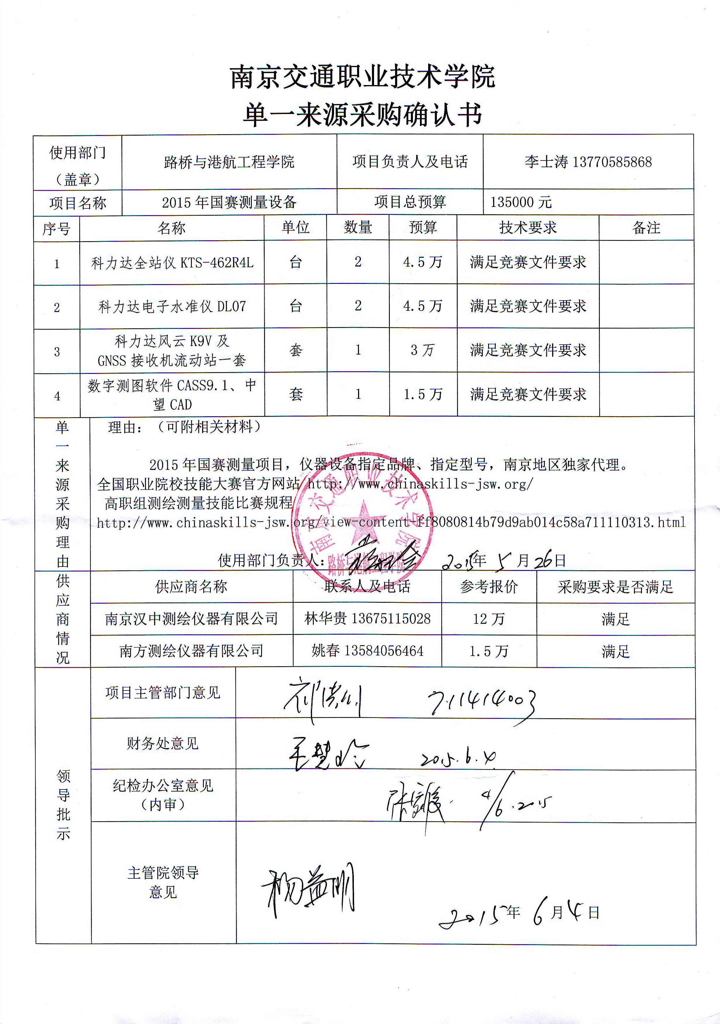 我部门受路桥与港航工程学院的委托,拟对该部门委托的采购编号为JY2015069号2015国赛测量设备采购项目实施院级采购。本部门根据采购人的实际申报情况,拟对该项目采用单一来源采购方式。