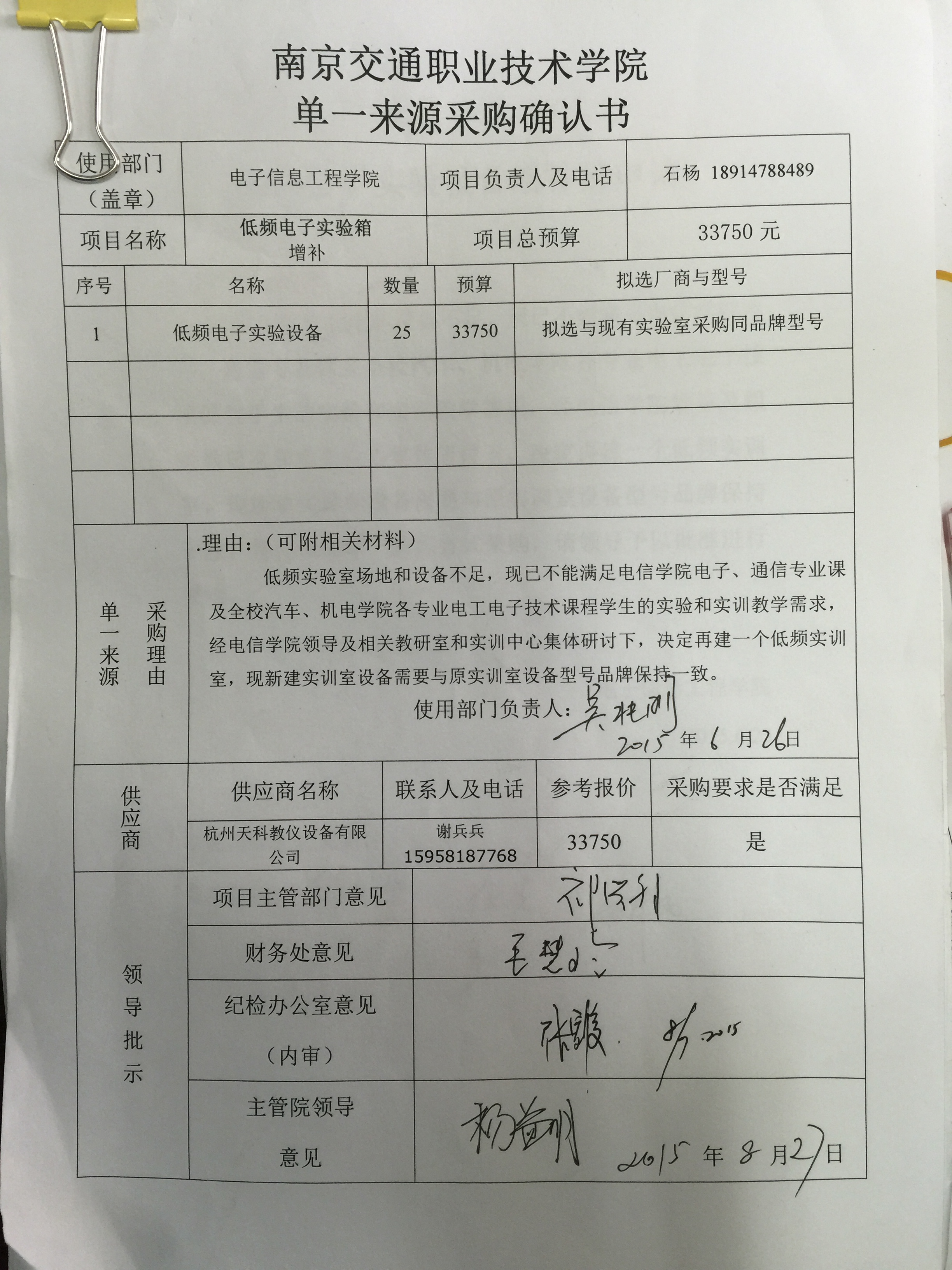 我部门受电子信息工程学院的委托,拟对该部门委托的采购编号为JY2015098号低频电子实验箱增补项目实施院级采购。本部门根据采购人的实际申报情况,拟对该项目采用单一来源采购方式。
