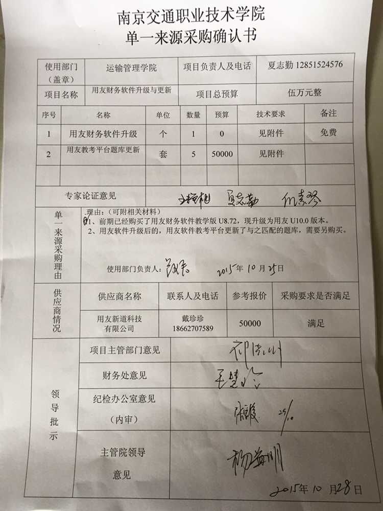 我部门受运输管理学院的委托,拟对该部门委托的采购编号为JY2015122号用友财务软件升级与题库更新项目实施单一来源采购。