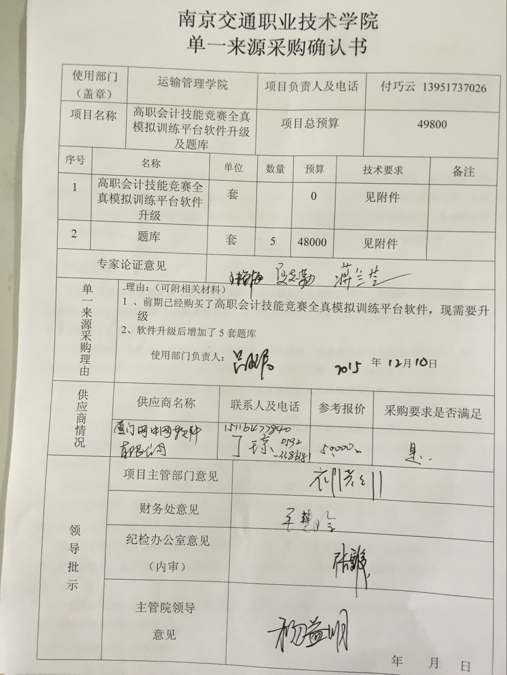 我部门受运输管理学院的委托,拟对该部门委托的采购编号为JY2015128号高职会计技能竞赛全真模拟训练平台升级与题库更新项目实施单一来源采购。