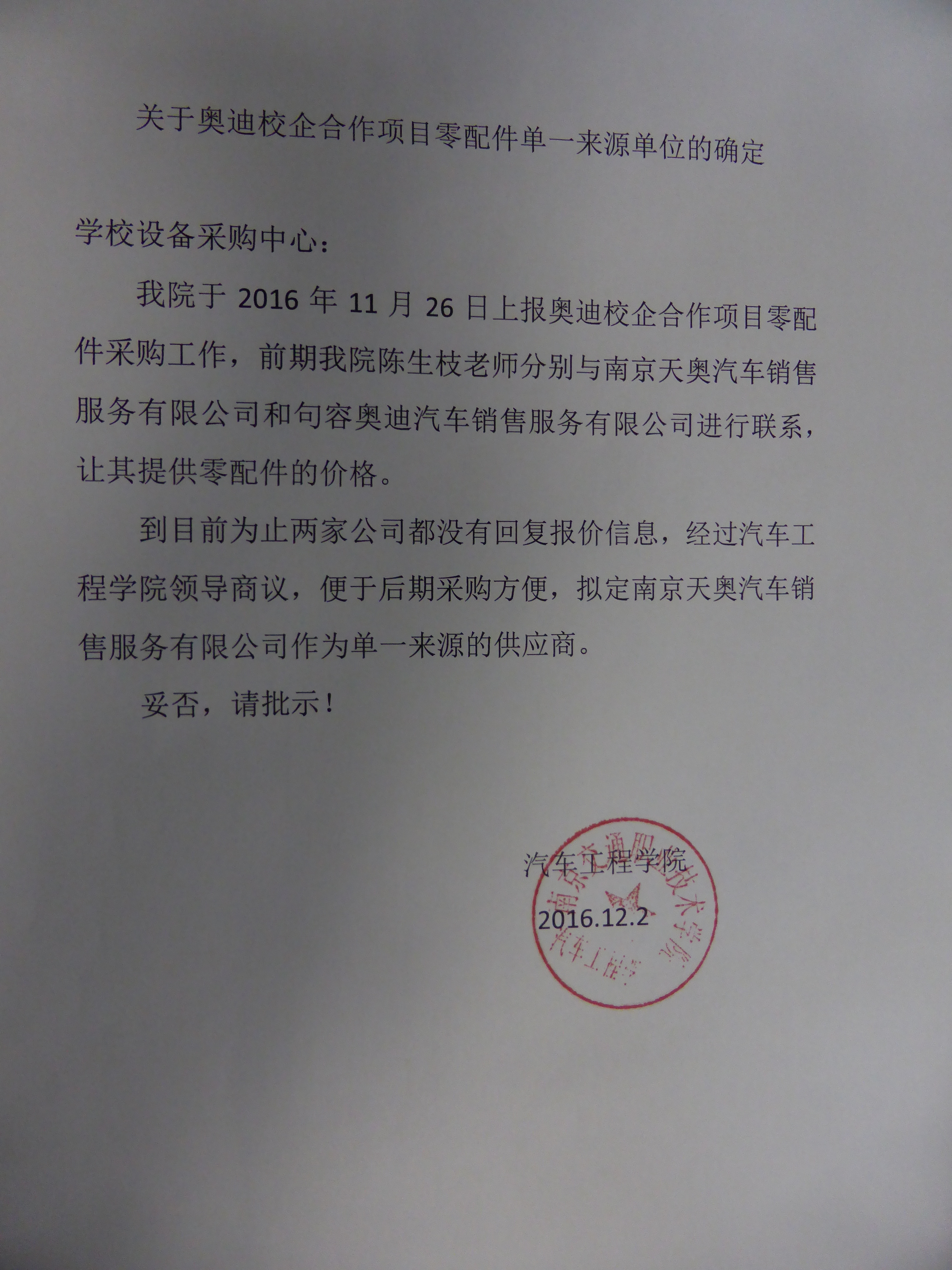 受汽车学院委托,根据学院领导单一来源审批,学院物资采购管理办公室对其所需一汽奥迪校企合作配件进行单一来源采购,按规定程序就本次采购信息公布如下: