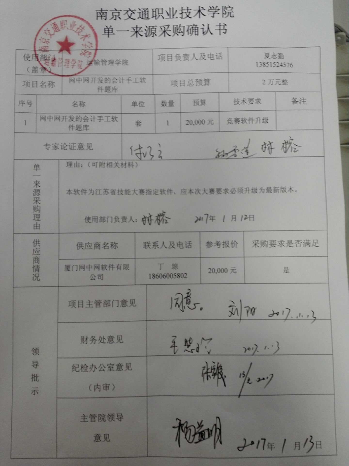 我部门受运输管理学院的委托,拟对该部门委托的采购编号为JY2017008号会计技能大赛手工软件题库项目实施院级集中采购。本部门根据采购人的实际申报情况,拟对该项目采用单一来源采购方式。