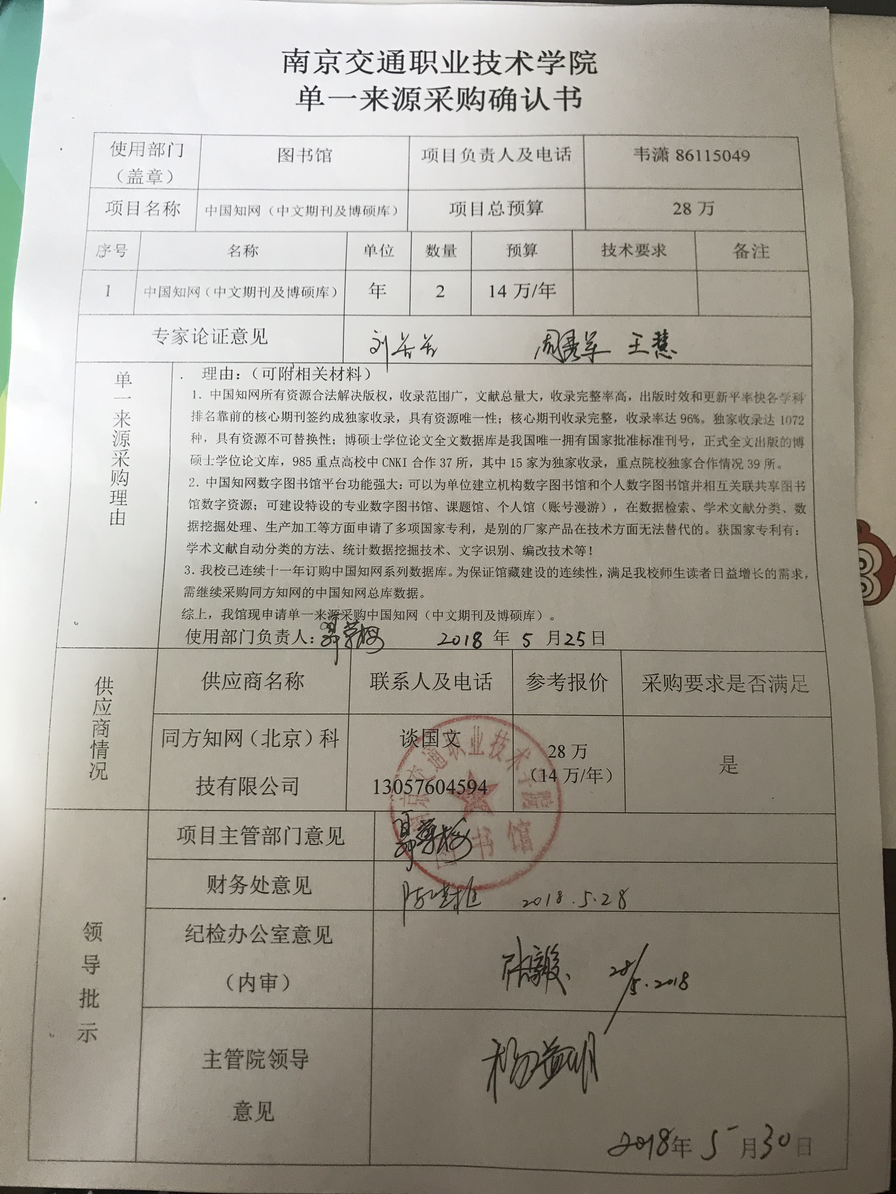 受学院图书馆学院委托,学院物资采购管理办公室对中国知网(中文期刊及博硕库)采购项目进行单一来源采购。现将采购人的单一来源申请材料进行网上公示(具体材料见上传附件),如有异议者,可以在公示期内,携书面材料(加盖公章)与我部门联系,逾期将不再受理。