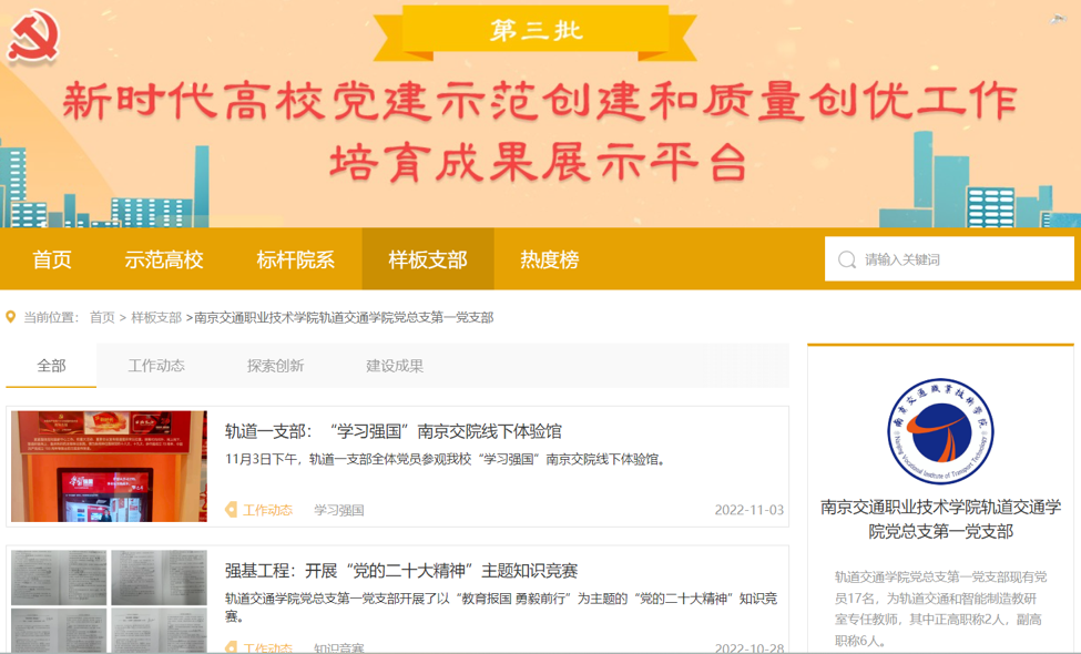作为第三批全国党建样板支部建设培育单位,轨道交通学院党总支第一党支部探索“1234”党建工作模式,以“强基铸魂,立德树人”党建品牌创建为抓手,教育引导广大教师党员在理论学习中筑牢马克思主义信仰之魂,在创新探索中提升教学水平,在一言一行中树立教师形象,以实际行动落实“立德树人”根本任务,践行“为党育人、为国育才”使命。