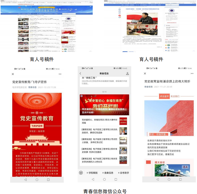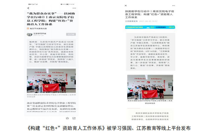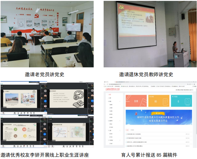 党支部邀请南京交通职业技术学院关工委 80 余岁老党员罗家琚同志和老党员赵家华同志开展党史专题报告。邀请 2017 级优秀校友李妍开展“我的大学我的职业生涯路”线上讲座。通过青春信息微信公众号共推送 185 期宣传文章,通过南京交通职业技术学院网站共计发布25 篇党建宣传报道,工作案例《构建“红色+”资助育人工作体系》被学习强国、江苏教育、江苏党史主题教育等线上平台发布。工作案例《筑牢基层党建“三阵地” 力促育人工作“两融合”》成功入选江苏高校党建工作典型案例 100 例。