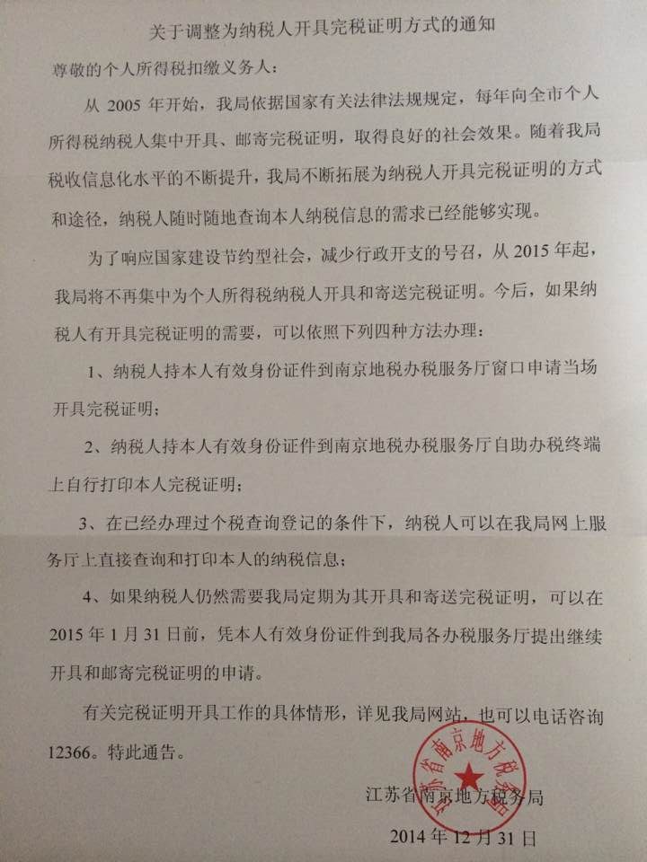 南京市地税局关于调整为纳税人开具完税证明方式的通知