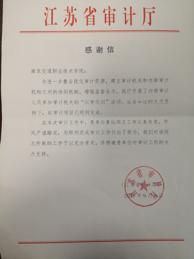 9月9日,江苏省审计厅发来感谢信,感谢我校财务处黄灿同志在暑期外借审计厅工作期间,认真负责,作风严谨踏实,对其付出的努力给予了充分肯定。