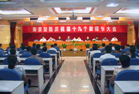 二○○三年九月十日下午,我院隆重举行庆祝第十九个教师节大会。省交通厅党组成员、副厅长、省纪委驻交通厅纪检组组长李先友、省教育厅副厅长殷翔文、省交通厅政治处处长汪祝君、教育厅师资处副处长张兆臣等领导出席了大会,向我院教职工致以节日的祝贺。省交通厅李副厅长代表省厅向我院颁发慰问金。大会由党委书记史国君同志主持。