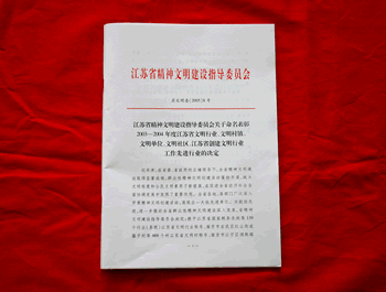 近日,根据苏文明委[2005]8号文件《关于命名表彰2003—2004年度江苏省文明行业、文明村镇、文明单位、文明社区、江苏省创建文明行业工作先进行业的决定》,我院被江苏省精神文明建设指导委员会表彰为“2003—2004年度省文明单位”。