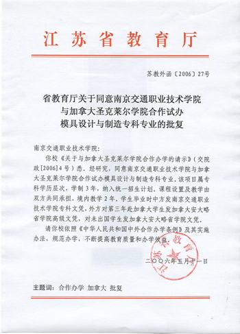 近日,我院《关于与加拿大圣克莱尔学院合作办学的请示》获教育厅正式批准,正式同意我院与加拿大圣克莱尔学院合作试办模具设计与制造专科专业。该项目属专科学历层次,学制3年,纳入统一招生计划。课程设置及教学由双方共同承担,境内教学2年。学生毕业时中方发南京交通职业技术学院专科文凭,外方对第三年赴加拿大学生发加拿大安大略省学院高级文凭,对未出国学生发加拿大安大略省学院文凭。