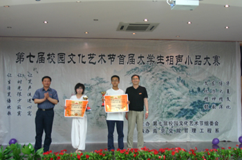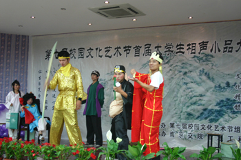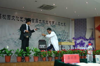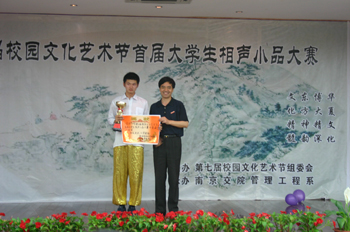 6月2日晚,学院首届大学生相声小品大赛在明德楼报告厅热烈举行。院党委书记孟祥林、副书记许正林,副院长高进军及学院第七届校园文化艺术节组委会部分成员出席并观看了比赛。 参赛节目多数为学生原创作品,生活素材丰富,表演诙谐幽默、妙趣横生。表演者以大学生特有的视角诠释了相声小品这一传统艺术的文化魅力。最终,信息工程系的相声《笑谈奥运》、管理工程系的小品《理发》及公路工程系的小品《追忆大学生活》等节目分别荣获一、二、三等奖。