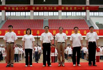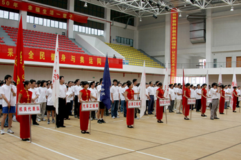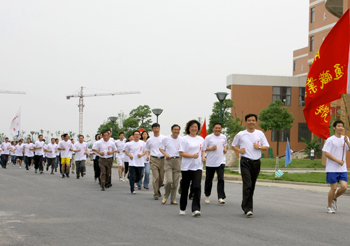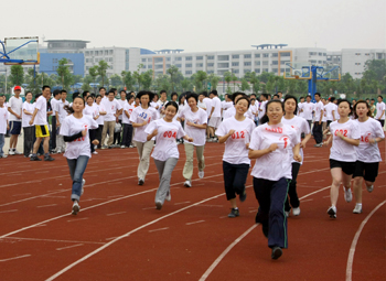 在2008北京奥运即将到来之际,为倡导全民健身的健康理念,营造浓郁的迎奥运氛围,学院于6月11日下午热烈举行迎奥运教职工综合运动会。院党委书记孟祥林,院长贾俐俐,院党委副书记许正林,副院长高进军、王晓农,副院级调研员陈玉龙等全体院领导出席并与全体教职工一同参加了活动。
