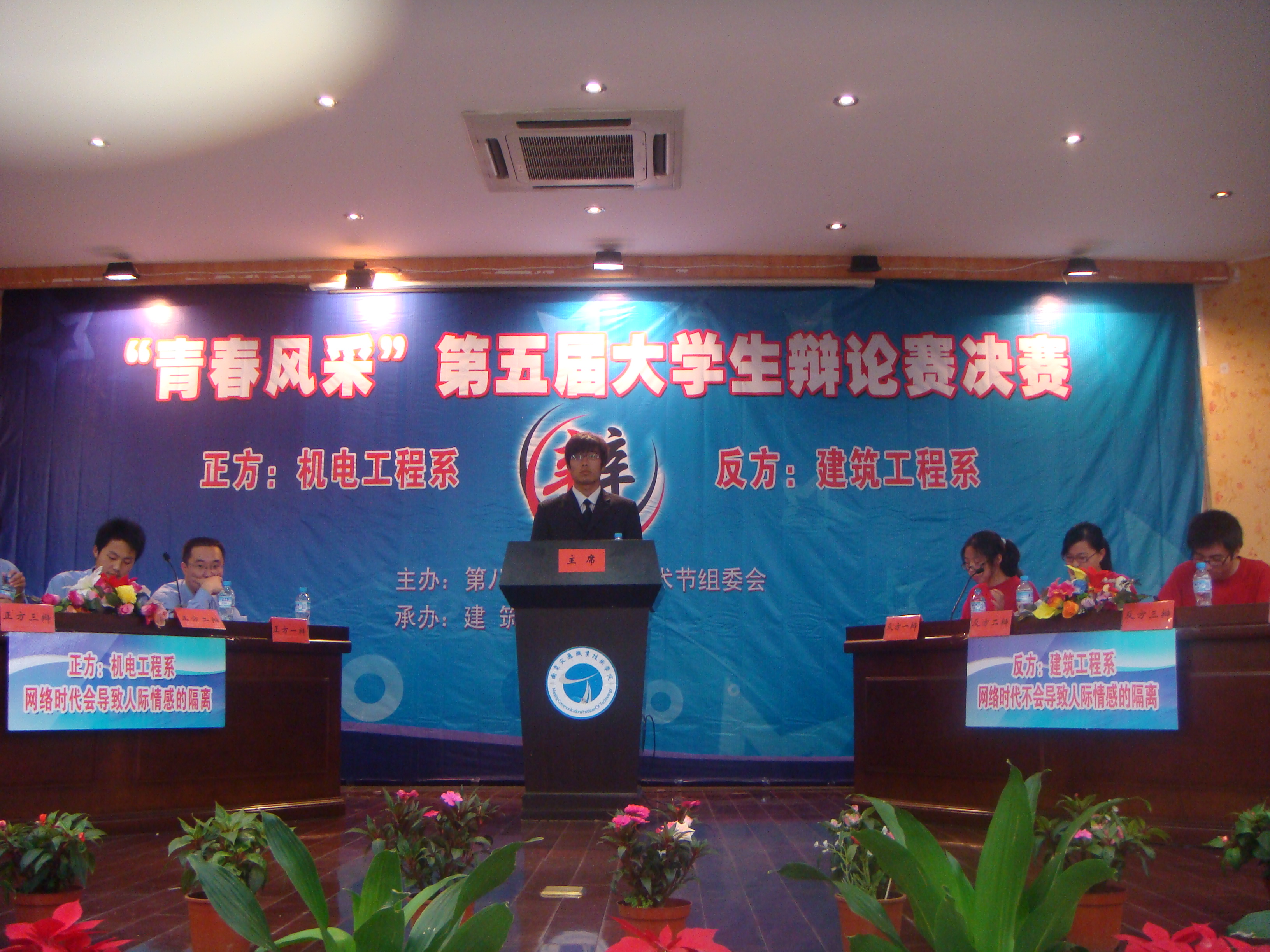 经过预赛,机电工程系代表队和建筑工程系代表队从七支代表队中脱颖而出,得到决赛入场券。本场辩论赛的主题是“网络时代是否会使人际关系隔离冷淡”。比赛中,辩手们丰富的知识背景,理性又激情的陈述,精彩犀利的辩驳,绅士般的表现,赢得场下观众一阵强于一阵的掌声。
