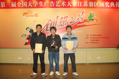 在刚刚结束的第三届全国大学生广告艺术大赛中,学院人文艺术系视觉传达艺术设计专业李运佳、符金绿同学设计的公益类广告作品《用知识支撑信心中国》(指导教师:宋寿剑)荣获国家一等奖,《跑步篇、篮球篇、跳高篇》(作者:张雨逸 孙萍 王熙诺)、《信心之火 可以燎原》(作者:徐金龙 刘红佳 邱艳)、《仙居特色——品 售 游》(作者:李如华 项梁 姚陈)、《中国武当》(作者:洪嘉忆)、《选择篇》(作者:史可本 胡娇 张皓 李晓丹 干露)五件作品荣获国家优秀奖,人文艺术系宋寿剑老师荣获国家和江苏赛区优秀指导教师奖。