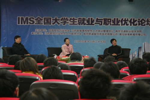 12月27日晚,“IMS全国大学生就业与职业优化论坛”在学院明德楼报告厅举行。本次论坛主要的话题就是如何将社会精英教育资源和理念向高职高专院校转移,强化高职院校学生的综合素质培养,为企业打造复合型IT人才,解决学校和企业在供求衔接上的问题。出席本次论坛的嘉宾有学院王晓农副院长,上海终身教育体系的研发核心、教育学博士后、美国OOPSYSTEMS公司中国区首席代表王翔教授,全球第一家在韩国上市的中国企业——深圳三诺集团副总裁李菲女士,日籍华人南京大学商学院教育学专家马吟秋教授和一些企业家代表。学院300余名学生到会聆听。