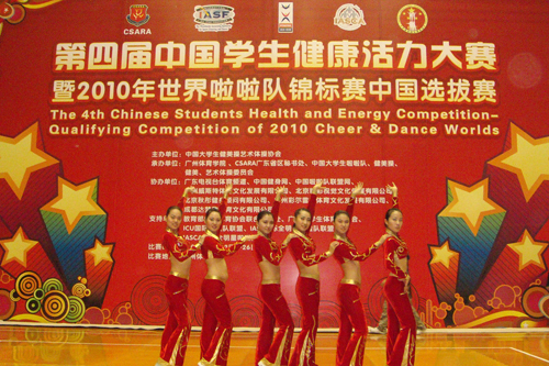 12月22至26日,第四届中国学生健康活力大赛暨2010年世界啦啦队锦标赛中国选拔赛在广州体育学院举办,共有来自全国92所大中小学健美操代表队参加了此次比赛。其中参加大学组健身健美操六人轻器械操比赛的高校有21所,我院获得该项目的第三名。