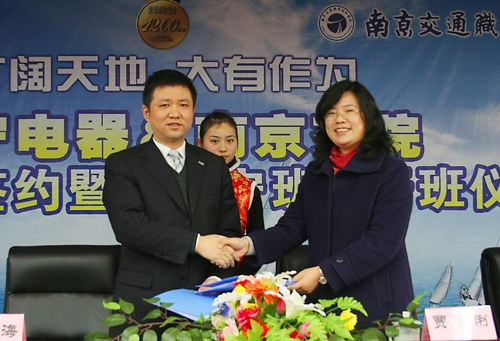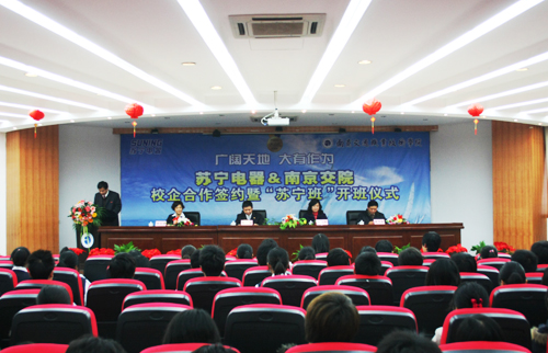 1月19日下午,学院与苏宁电器集团校企合作协议签字仪式暨首届“苏宁班”开班仪式在明德楼报告厅举行。学院院长贾俐俐代表学院与苏宁电器集团副总裁兼南京地区管理中心陶京海总经理签署了“南京交院—苏宁电器校企合作协议书”。副院长高进军,苏宁电器集团副总裁兼南京地区管理中心总经理陶京海、苏宁电器集团南京地区管理中心人力资源部经理邹冬萍出席仪式。管理工程系和相关职能部门负责同志参加了仪式。
