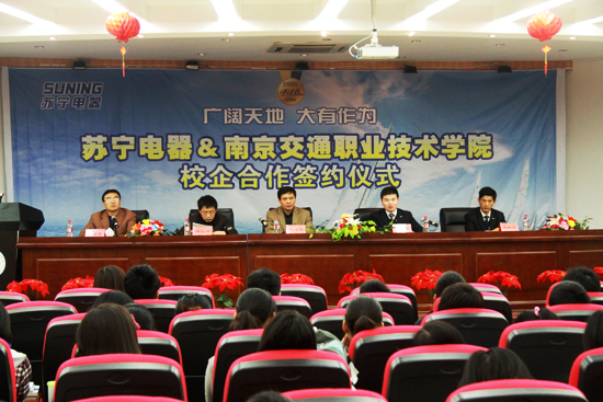 高进军副院长、苏宁集团南京大区总经理助理张海峰在仪式上分别致辞。校企双方签署了合作协议。苏宁电器向学院电子信息工程系授发了“苏宁维修工程师班”匾牌,“苏宁班”学生代表作了发言。