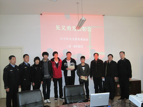 4月15日上午,江宁区见义勇为基金会在学院明德楼403会议室召开见义勇为表彰会,对学院4名见义勇为学生进行了表彰。江宁科学园派出所王静所长、学院纪委应海宁书记出席,江宁科学园派出所,院党委办公室、组织宣传部、学工处相关负责人和各系辅导员、学生代表参加了会议。会议由王静所长主持。江宁电视台记者进行了现场采访。