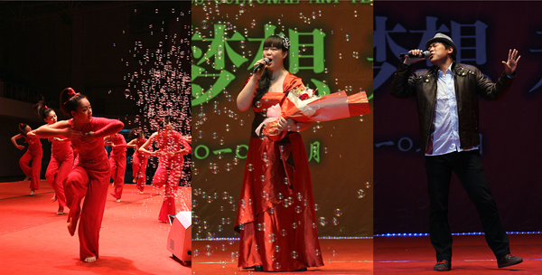 晚会先后表演了大合唱《大地飞歌》、健美操《动感节拍》、诗朗诵《青春万岁》、独唱《酒醉的探戈》、二胡与小号《美丽的神话》、舞蹈《如火的青春》、动感组合《青苹果乐园》、相声《论捧逗》、联唱《青春火焰》、女声独唱《情深谊长》、魔术《扑克牌》、歌舞《年轻的歌》等12个节目。师生同台演出,节目精彩纷呈,气氛尤为热烈。