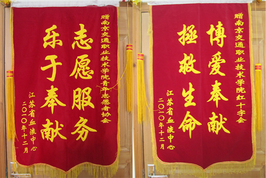 1月5日,江苏省血液中心给学院送来“博爱奉献 拯救生命”、“志愿服务 乐于奉献”两面锦旗,对学院在无偿献血中所做工作表示感谢。2010年,学院两次协助省血液中心组织学生献血近2000人次,院红十字会、青年志愿者协会会员们默默承担了大量工作,有效保障了无偿献血工作的顺利进行。学院学工处王平处长获“南京市红十字会系统优秀志愿者”称号