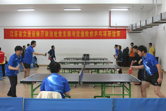 22日下午,省交通运输厅政治处党支部13名成员在行健馆开展了乒乓球比赛,并和部分交通院校领导进行了乒乓球友谊赛。