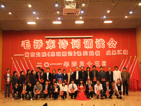 4月13日晚,在各班级层层选拔的基础上,思政教研部在院大学生活动中心举办了全院《思政概论》课实践教学成果汇报——毛泽东诗词诵读会。参赛选手精神饱满、充满激情的诵读,赢来评委老师和同学们的阵阵掌声。35位选手经过90分钟的激烈角逐,共产生一等奖3名、二等奖5名、三等奖7名、鼓励奖若干。通过这次活动,同学们加深了对党和国家的缔造者毛泽东伟人风范的理解和认识,展现了当代大学生的风采,凸显了实践教学活动的丰硕成果。