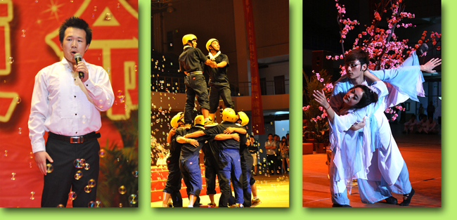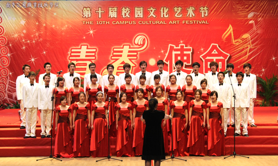 晚会在轻快悦耳的大合唱《青春舞曲》、《年轻的歌》中拉开帷幕,舞蹈《pretty girl》、健美操与武术《舞•武》、男声独唱《江河万古流》、诗朗诵《壮哉!青春》、双人舞《众里寻你》、重唱《梦田》、女声独唱《幸福万年长》、舞蹈《咱们工人有力量》等节目悉数亮相,与“青春•使命”主题精彩辉映。现场气氛热烈,师生同台演出,有思想的翱翔,有感情的抒发,有青春的旋律,有智慧的展示,有毅力的体现,有诗意的飞扬。