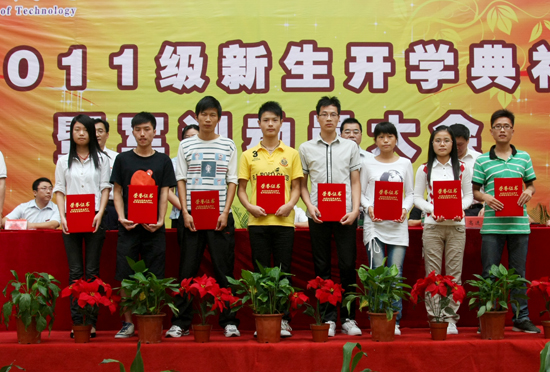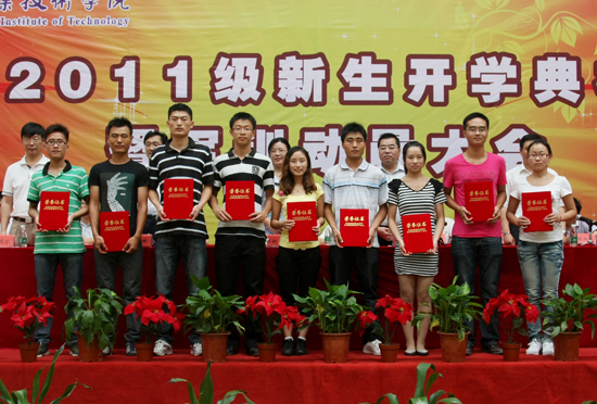 上午9︰30,2011级新生开学典礼在庄严的国歌声中拉开帷幕。高进军副院长通报了荣获2010—2011学年“院长奖学金”和“十佳青年学生”的名单。全体院领导向获奖同学颁奖。