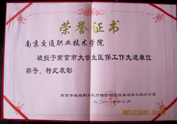 12月31日,在南京市大学生医保工作表彰大会上,学院获得“南京市大学生医保工作先进单位”荣誉称号。张丽君同志被评为“南京市大学生医保工作先进个人”。