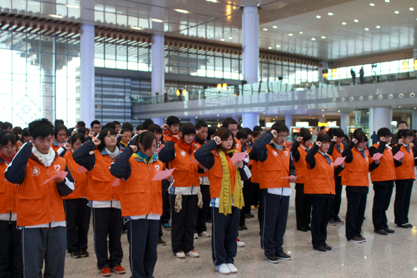 元月8日上午,南京铁路南站春运青年志愿者活动暨“博爱青年志愿者服务站”启动仪式在南站候车大厅举行。院党委副书记许正林出席。团委负责同志及学院近100名青年志愿者参加。启动仪式上,学院团委与南站团委正式签署了共建志愿基地协议书,志愿者们宣读了志愿誓词,正式拉开了春运志愿服务活动的序幕。
