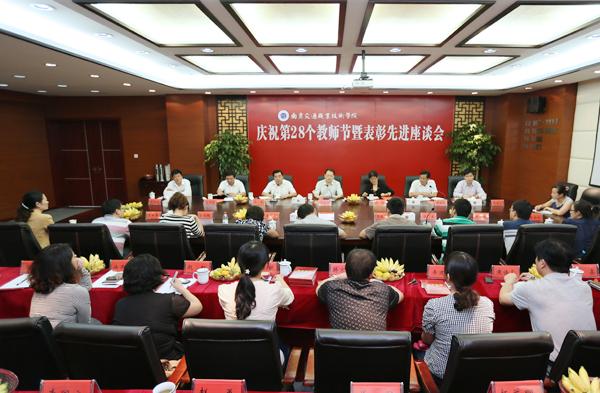 9 月 10日下午,学院在行健馆会议室召开庆祝第28个教师节暨表彰先进座谈会。省交通运输厅党组成员、副厅长汪祝君,厅政治处副调研员叶坚,学院领导出席座谈会,与各系部优秀教师代表、相关职能部门负责人共庆节日。座谈会由党委副书记许正林主持。