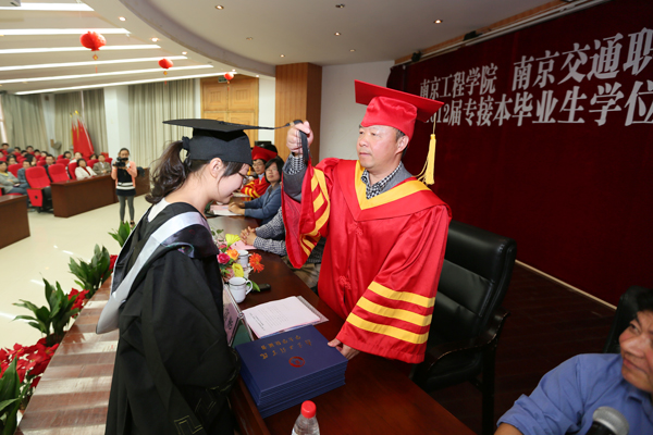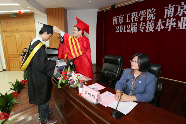 仪式在庄严的国歌中拉开序幕。周传林副院长首先宣读了《关于表彰‘专接本’优秀学员的决定》。南京工程学材料工程学院院长王章忠教授、经济管理学院院长陆富彬教授分别宣读了《关于授予何宗华等25名同学工学学士学位的决定》、《关于授予柏晶晶等24名同学管理学学士学位的决定》,并分别为获得学士学位的毕业生正冠拨穗、颁发学位证书。